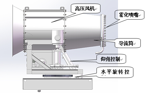 型号HC-120 发电机功率:150KW柴油发电机组,水平射程(静风)110-120米,风机功率:55KW,泵电机功率:15KW多级离心泵,喷雾流量:260L/min,工作压力:1.0-2.0MPa,雾谱范围:50-150um,仰俯角度:﹣5°-60°,旋转角度:360°, 方式:手动/遥控